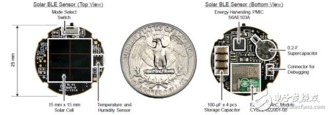 [圖1:微型無(wú)線傳感器使用具有集成BLE射頻的微控制器(MCU)而創(chuàng)建,經(jīng)優(yōu)化后僅用能量采集電源管理IC所提供的電源運(yùn)行。圖中為完整的無(wú)線傳感器 -- CYALKIT-E02太陽(yáng)能供電BLE傳感器參考設(shè)計(jì)套件(RDK)。]