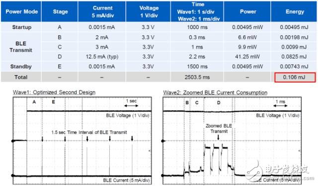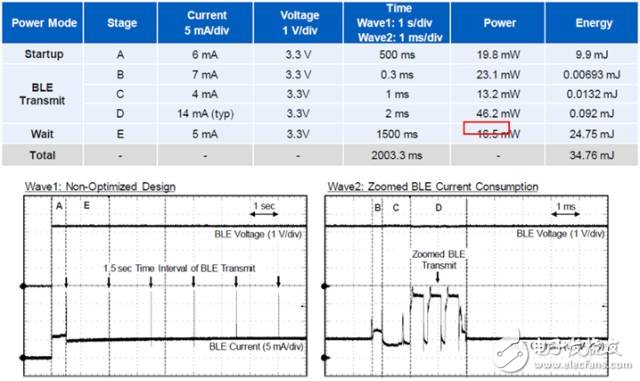 可以使用電壓和電流波形計(jì)算平均消耗電流以確定BLE設(shè)計(jì)的高效。圖4顯示了無(wú)功率優(yōu)化設(shè)計(jì)的功耗結(jié)果。