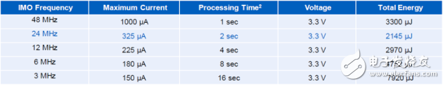 3-MHz到48-MHz內(nèi)部主振蕩器(IMO)是主要的內(nèi)部時(shí)鐘源。IMO的默認(rèn)頻率是48 MHz,可在3 MHz到48 MHz范圍內(nèi)以1 MHz的步長(zhǎng)調(diào)節(jié)。在默認(rèn)的校準(zhǔn)設(shè)置下,IMO與本例中RDK的公差為±2%。圖7顯示了改變IMO頻率后的總功耗示例。