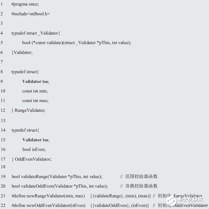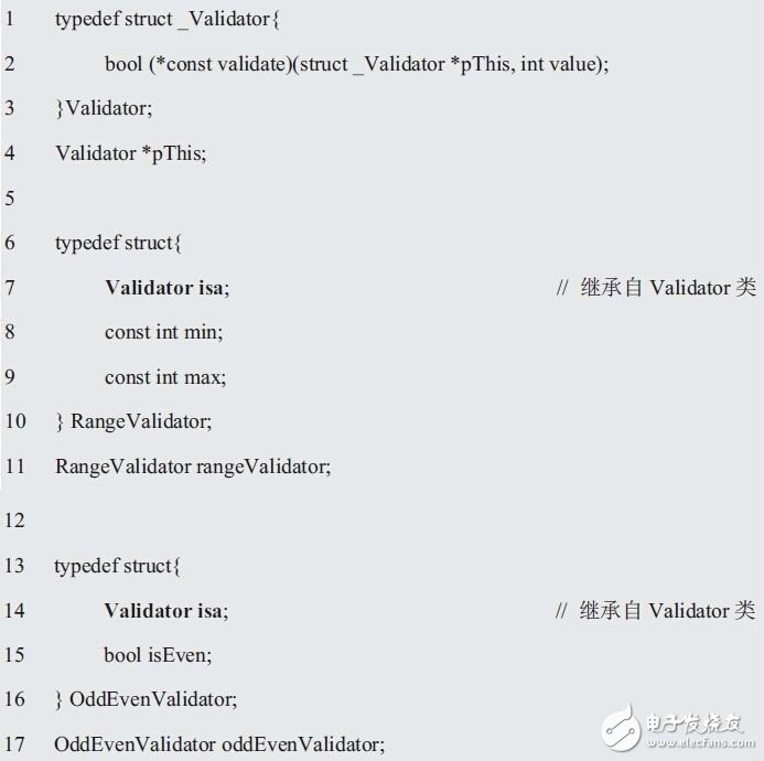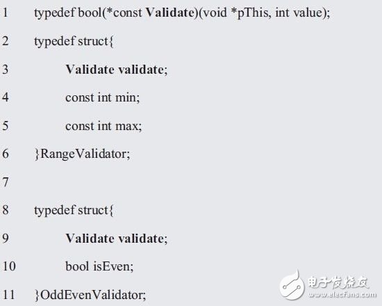基于此,在將具有可變性的校驗參數(shù)分別轉(zhuǎn)移到RangeValidator和OddEvenValidator中的同時,并將Validator類型的變量isa作為結(jié)構(gòu)體的成員,即可創(chuàng)建新的結(jié)構(gòu)體數(shù)據(jù)類型: