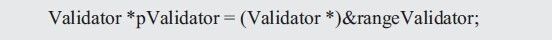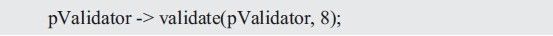 其中,pThis是指向當前對象的指針,Validator是一個沒有具體屬性,代表多種具有共性的數(shù)據(jù)和行為的具體校驗器總稱的抽象類。Validator類沒有提供任何實現(xiàn)validate方法的代碼,正是因為這一點,該方法才能成為一個抽象的方法,因為提供任何代碼都會使方法成為具體方法。