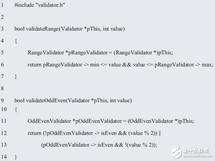 在面向過程編程中,新手對共性的認識往往來源于直覺,以創(chuàng)建范圍值校驗器類和偶校驗器類為例,程序員普遍都會按照以下方法表達這種共性,將Validate提取為一個公共的函數(shù)指針。比如: