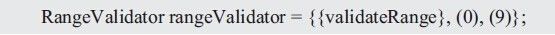 在這里,還是以范圍值校驗器為例,假設min=0,max=9,如程序清單 4.10(22)所示的使用名為newRangeValidator的宏將結(jié)構(gòu)體初始化的使用方法如下: