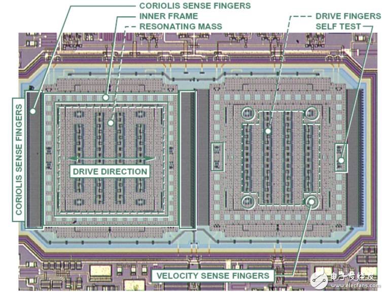 陀螺儀的內(nèi)部原理是這樣的:對固定指施加電壓,并交替改變電壓,讓一個(gè)質(zhì)量塊做振蕩式來回運(yùn)動(dòng),當(dāng)旋轉(zhuǎn)時(shí),會(huì)產(chǎn)生科里奧利加速度,此時(shí)就可以對其進(jìn)行測量;這有點(diǎn)類似于加速度計(jì),解碼方法大致相同,都會(huì)用到放大器