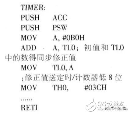 從程序人手,采用動(dòng)態(tài)同步修正方法給定時(shí),計(jì)數(shù)器賦初值。動(dòng)態(tài)同步修正方法如下:由于定時(shí),計(jì)數(shù)器溢出后,又會(huì)從O開(kāi)始自動(dòng)加數(shù),故在給定時(shí)/計(jì)數(shù)器再次賦值前,先將定時(shí),計(jì)數(shù)器低位(TLO)中的值和初始值相加,然后送人定時(shí),計(jì)數(shù)器中,此時(shí)定時(shí),計(jì)數(shù)器中的值即為動(dòng)態(tài)同步修正后的準(zhǔn)確值。具體程序如下: