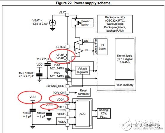 曾有工程師反映,之前用STM32F1系列芯片好好的,后來因為產品需要,改用STM32F2或STM32F4芯片后,發(fā)現(xiàn)芯片根本不能正常工作,即使最簡單的程序也跑不順暢。后來發(fā)現(xiàn)其中有部分異常情況源于使用者沒有處理VCAP引腳。STM32F1系列芯片沒有外部VCAP引腳,而F2/F4等系列芯片有VCAP腳的,該類腳需外接合適的電容到地,以保證內核供電的穩(wěn)定。【部分STM8也有VCAP腳】