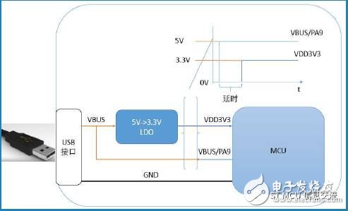 STM32芯片從外部USB主機的VBUS取電。外部VBUS的供電經(jīng)過一個LDO后再給STM32 MCU供電,同時,MCU的另外一個GPIO【PA9】與外部VBUS直接相連。