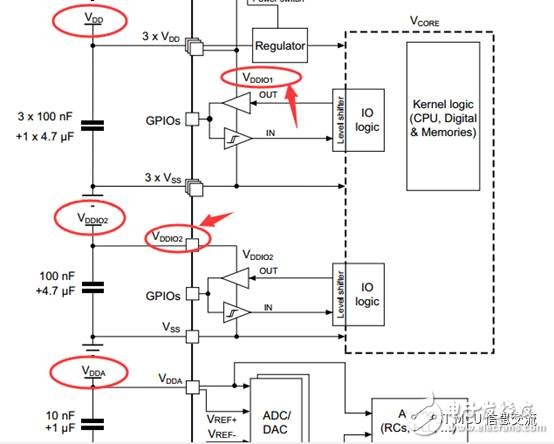 順便說下,整體上講,STM32不同系列間移植時軟硬件的兼容性還是很高的,尤其硬件管腳方面的兼容性。不同系列間相同腳位數(shù)的管腳安排的差異大多體現(xiàn)在與電源相關的管腳,這點要特別注意。另外提醒下,部分STM8芯片也有這個VDDIO腳。