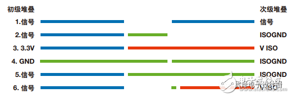 本示例中,每個(gè)輸出域與其他域隔離,但是我們?nèi)阅芾靡恍┙化B電容。圖3顯示了這種堆疊,可看到每個(gè)isoPower器件可增加電容以及相鄰隔離區(qū)連接的情況。