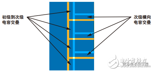 埋層(原邊3、4層,副邊2至5層)可承載電力和接地電流。跨越隔離柵的交疊(例如原邊上的第4層GND和副邊上的第3層 V Iso)可形成理想的拼接電容。通過(guò)多層PCB堆疊可形成多個(gè)交疊,從而提高整體電容。為使電容最大,還必須減小參考層之間PCB電介質(zhì)材料的厚度。