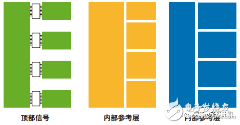 由于內(nèi)層拼接電容能夠構(gòu)建低電感結(jié)構(gòu),因此最具優(yōu)勢(shì)。在整體PCB區(qū)域受限的情況下,采用多層PCB就是很好的方式。采用盡可能多的層數(shù)切實(shí)可行,同時(shí)盡可能多的交疊電源層和接地層(參考層)。圖1為一個(gè)堆疊示例。