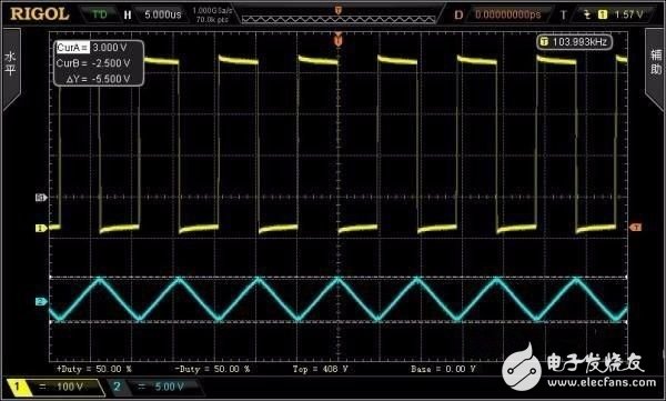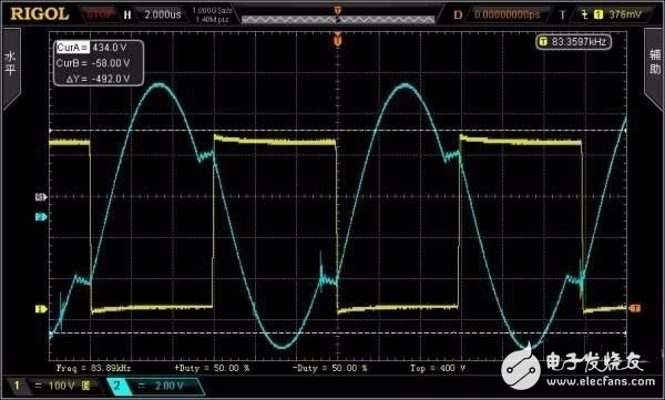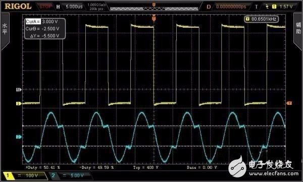 藍(lán)色為用電流互感器測(cè)試到的諧振網(wǎng)絡(luò)的電流波。