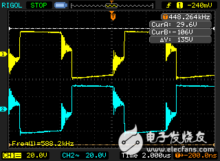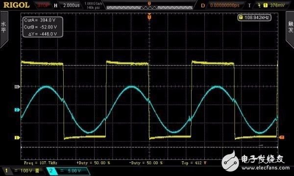 當(dāng)調(diào)整好參數(shù)滿載時(shí),確實(shí)發(fā)現(xiàn):通過(guò)減低匝比來(lái)降低滿載時(shí)諧振網(wǎng)絡(luò)的增益值,確實(shí)而有效的提升了開關(guān)頻率。滿載時(shí)的開關(guān)頻率為109K,諧振頻率為115K,已經(jīng)比較接近。觀察電流波形,也有比較好的效果。如圖5所示。
