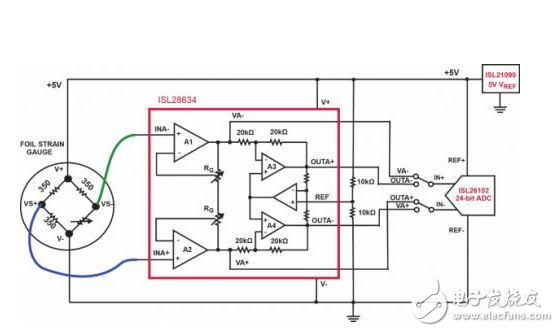 儀表放大器是適合壓力或溫度測量等各種應(yīng)用的出色組件,它的主要作用包括信號放大和阻抗適配。在許多情況下,儀表放大器具有參考輸入引腳。在參考引腳上增加電壓會使輸出信號升高同等電壓。這樣就能簡單精確地將儀表放大器的輸出調(diào)整到ADC所需的輸入電平,從而可以使用ADC的完整輸入范圍,同時提高分辨率。在具有高共模信號的情況下,另一優(yōu)勢是極為出色的共模抑制比和高精度。