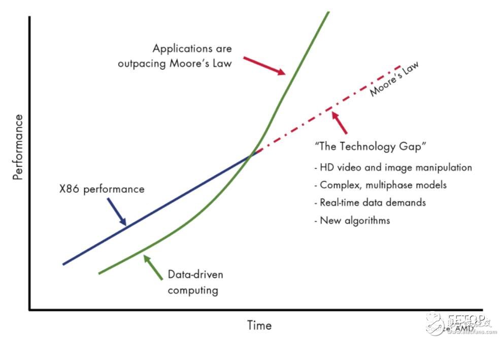 一方面處理器性能再無法按照摩爾定律進行增長,另一方面數(shù)據(jù)增長對計算性能要求超過了按“摩爾定律”增長的速度。處理器本身無法滿足高性能計算(HPC:High PerformanceCompute)應用軟件的性能需求,導致需求和性能之間出現(xiàn)了缺口(參見圖1)。