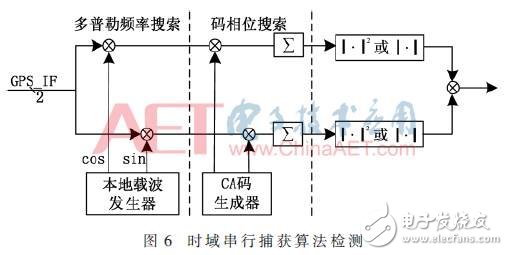 時(shí)域串行捕獲算法如圖6所示,即本地載波生成器在預(yù)先設(shè)定的多普勒頻率范圍內(nèi)選擇一個(gè)載波頻率,產(chǎn)生兩路相位差 90°的本地載波cos和sin。將輸入信號與這兩路本地載波混頻,得到同相分量I和正交分量Q。然后將I和Q兩路分量分別與本地產(chǎn)生的C/A碼序列進(jìn)行相關(guān)運(yùn)算,并通過絕對值求和Absolute或平方求和square運(yùn)算得到相關(guān)值[9-10]。