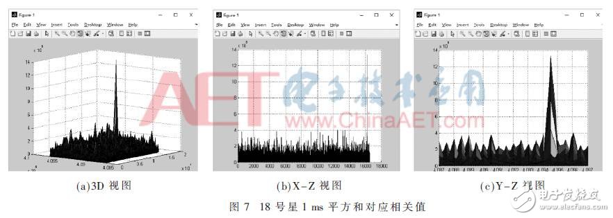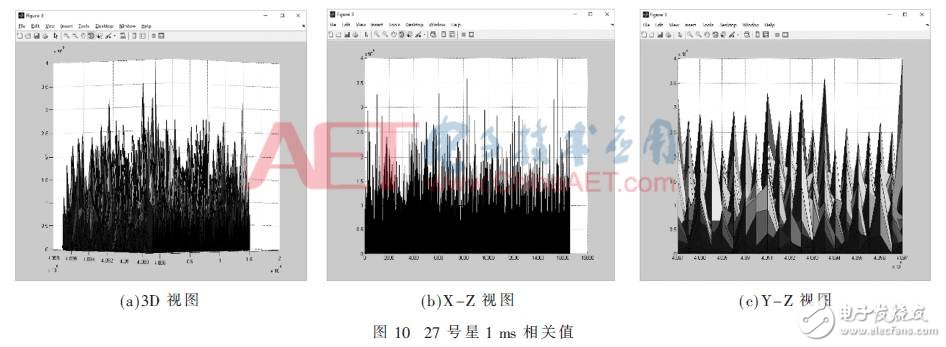 通過圖5中的SV-Searching Paramenters窗口可設(shè)置參數(shù),進(jìn)行數(shù)據(jù)分析。源文件為當(dāng)前數(shù)據(jù)采集轉(zhuǎn)換后的0-1二進(jìn)制序列文件,通過設(shè)置衛(wèi)星號SV num(1至32號衛(wèi)星)、毫秒積分ms num(1 ms至10 ms)、量化位LO bits(1 bits至10 bits)和多普勒頻率范圍LO Frequency、CA碼相位C/A Phase以及相對應(yīng)的頻率步長LO Step、C/A步長C/A Step等參數(shù),點(diǎn)擊Analysis鍵,對其進(jìn)行CA碼和多普勒頻率的二維搜索。通過時(shí)域串行捕獲算法計(jì)算得到三維數(shù)據(jù),并利用Matlab的surf函數(shù)仿真出三維立體圖,從而分析信號的可靠性[8]。