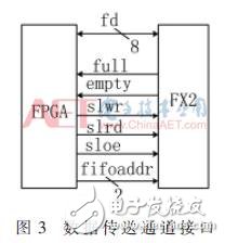 數(shù)據(jù)傳送即通過FX2 的Slave FIFO模式,將從RAM中讀出的數(shù)據(jù)上傳至上位機(jī)PC并保存,其高速數(shù)據(jù)傳送通道接口圖如圖3所示[5]。在開始傳送數(shù)據(jù)前,需通過Slave FIFO的切換地址fifoaddr配置Slave FIFO為2′b10,使其能夠向FX2的Slave FIFO寫入數(shù)據(jù)。接收到數(shù)據(jù)傳送指令后,主程序?qū)崟r(shí)監(jiān)控Slave FIFO的空滿標(biāo)志empty、full。當(dāng)發(fā)現(xiàn)Slave FIFO未滿時(shí),通過控制Slave FIFO的寫時(shí)鐘slwr,將從RAM讀出的數(shù)據(jù)傳送至Slave FIFO的雙向數(shù)據(jù)端口fd,構(gòu)成了高速數(shù)據(jù)通道,完成數(shù)據(jù)上傳。