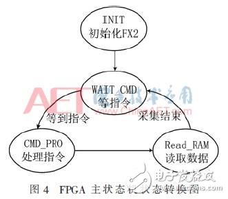 FPGA主狀態(tài)機(jī)的狀態(tài)轉(zhuǎn)換圖如圖4所示,整個(gè)狀態(tài)機(jī)工作在72 MHz時(shí)鐘下,INIT狀態(tài)對FX2各接口數(shù)據(jù)進(jìn)行初始化,之后進(jìn)入WAIT_CMD狀態(tài),等待上位機(jī)發(fā)指令。當(dāng)上位機(jī)發(fā)出采集指令后,由USB向FX2內(nèi)部8051芯片下傳48 B數(shù)據(jù)發(fā)送指令,再由8051將此48 B數(shù)據(jù)寫入I2C的存儲(chǔ)器,并分析第一字節(jié)數(shù)據(jù)[6]。當(dāng)?shù)谝蛔止?jié)為8′h0a時(shí),狀態(tài)機(jī)進(jìn)入CMD_PRO狀態(tài),進(jìn)行指令處理,向RAM發(fā)出寫指令開始數(shù)據(jù)緩存,然后進(jìn)入READ_RAM狀態(tài),在識別FX2中Slave FIFO的空滿標(biāo)志等信號后,讀出RAM緩存數(shù)據(jù)。關(guān)于RAM讀寫調(diào)用在上文中有詳細(xì)介紹,這里不再贅述。當(dāng)采集結(jié)束后,狀態(tài)機(jī)重新回到WAIT_CMD狀態(tài),等待下一次采集。
