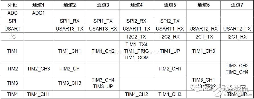 從外設(shè)(TIMx、ADCx、SPIx、I2Cx、和USARTx)產(chǎn)生的DMA請求,通過邏輯或輸入到DMA控制器,這就意味著同時(shí)只能有一個(gè)請求有效(在同一時(shí)間,就只能使用其中的一個(gè),其他通道也類似)。外設(shè)的DMA請求,可以通過設(shè)置相應(yīng)的外設(shè)寄存器中的控制位,被獨(dú)立的開啟或關(guān)閉。