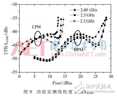 圖9為功放工作在HPM和LPM時的線性度(UTRAACLR1)圖。從圖中可知,在HPM時,輸出28 dBm時,頻帶內(nèi)線性度UTRAACLR1全都低于-36 dBc,可知在HPM時滿足4G系統(tǒng)的線性指標UTRAACLR1必須小于-33 dBc的要求。在LPM時,輸出12.5 dBm時,頻帶內(nèi)線性度UTRAACLR1全都低于-36 dBc。