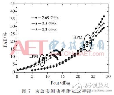 圖7為功放工作在HPM和LPM時的功率附加效率(PAE)圖。從圖中可知,在HPM時,功放的最高效率在頻帶內(nèi)都達到了30%,其中在2.5 GHz處的最佳效率達到38%;在LPM時,功放的最高效率在頻帶內(nèi)都達到了12%;其中在輸出功率為10 dBm時,LPM相對于HPM效率提高至少6%;由此可知,雙功率模式功放可以有效提高功放在功率回退區(qū)域的效率。