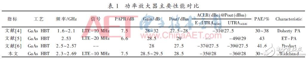 表1為本文所設(shè)計功放的HPM與同類型功率放大器研究與產(chǎn)品的主要性能對比。由表對比可知本章所設(shè)計功放在達到寬帶的同時,功放還獲得了較高的線性度和效率。此外,對比文獻[6]中國際大廠商Avago Technologies的產(chǎn)品,本章所設(shè)計功放性能已經(jīng)達到產(chǎn)品級,只是相比單頻帶應(yīng)用功放效率稍低,有很明顯的實用價值。