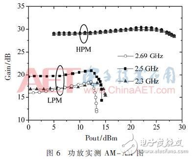 圖6為功放工作在HPM和LPM時的AM-AM圖。從圖中可知,在HPM時,增益(Gain)在頻帶內(nèi)都達到28.5 dB,滿足4G系統(tǒng)指標;從圖中還可以看出HPM的功率輸出P1dB已經(jīng)超過了28 dBm,實現(xiàn)了功放高線性度,滿足LTE_A的最大輸出功率要求,這說明輸出匹配狀態(tài)良好。在LPM時,頻帶內(nèi)增益(Gain)在16.5~20 dB之間波動,但相比仿真結(jié)果下降接近1 dB;從圖中還可以看出LPM的功率輸出P1dB已經(jīng)超過了12.5 dBm,達到了目標設(shè)定最大線性輸出至少11 dBm的要求。