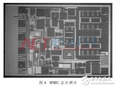 本文設(shè)計的雙功率模式寬帶功率放大器使用Win Semiconductors公司的InGaP/GaAs HBT和AlGaAs/InGaAs(D-Mode)pHEMT工藝進行了成功流片。如圖4所示為流片之后的MMIC芯片照片,芯片die的尺寸大小為750 μm×950 μm。該芯片與基板粘合在一起后,最終制作完成的功放芯片的大小為3 mm×3 mm。