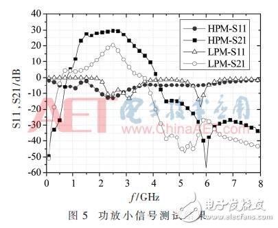 為了對芯片性能進行測試,將通過FR_4板材的PCB測試板搭載該芯片進行性能測試。功率放大器的工作電壓為3.4 V,使用安捷倫的網(wǎng)絡(luò)分析儀E5071C測得功率放大器HPM和LPM的小信號S參數(shù)S11和S21如圖5所示。HPM時,靜態(tài)電流大小為87 mA,其中從第一級到第三級靜態(tài)電流分別為15 mA、26 mA和48 mA;在2.3~2.69 GHz頻段范圍內(nèi)S21超過了29 dB;參數(shù)S11在頻率2.3~2.69 GHz之間也全都低于-10 dB。LPM時,靜態(tài)電流大小為20 mA,其中從第一級和第二級靜態(tài)電流分別為8 mA和12 mA;在2.3~2.69 GHz頻段范圍內(nèi)S21超過了17 dB,在2.5 GHz處S21達到最高值20 dB;參數(shù)S11在頻率2.3~2.69 GHz之間也全都低于-8 dB。以上說明小信號參數(shù)良好,在高功率模式下實現(xiàn)了小信號的寬頻帶。