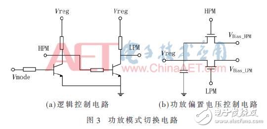 圖3所示為功放模式切換電路,包括邏輯控制電路和功放偏置電壓控制電路。圖3(a)為邏輯控制電路,通過該電路可以切換功放的功率模式;Vmode接低電平時,HPM點為高電平,LPM點為低電平,功放打開高功率模式通道;Vmode接高電平時,HPM點為低電平,LPM點為高電平,功放打開低功率模式通道。圖3(b)為功放偏置電壓控制電路,通過該電路可控制功放偏置電路的開與關(guān);當(dāng)高功率模式時,Vreg=VBias_HPM,VBias_LPM為低電平,高功率鏈路偏置打開,低功率電路偏置關(guān)閉;當(dāng)?shù)凸β誓J綍r,Vreg=VBias_LPM,VBias_HPM為低電平,高功率鏈路偏置關(guān)閉,低功率電路偏置打開。