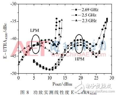 圖8為功放工作在HPM和LPM時的線性度(E-UTRAACLR1)圖。從圖中可知,在HPM時,輸出28 dBm時,頻帶內(nèi)線性度E-UTRAACLR1全低于-35 dBc,可知在HPM時滿足4G系統(tǒng)的線性指標E-UTRAACLR1必須小于-30 dBc的要求。在LPM時,輸出12.5 dBm時,頻帶內(nèi)線性度E-UTRAACLR1全都低于-35 dBc,可知在功率回退到12.5 dBm以下時功放可切換為LPM。