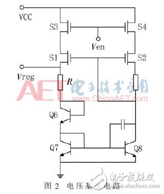 電壓基準電路如圖2所示,通過該電路可為功放的偏置電路提供偏置電壓Vreg。該基準電路為一個簡單的鏡像電路,通過晶體管Q6、Q7和電阻R可為偏置電路提供基準電壓Vreg;該電路可通過使能端Ven的電位高與低來控制基準電路的工作與關(guān)閉;當(dāng)基準電路關(guān)閉也意味著整個功放處于關(guān)閉狀態(tài)。