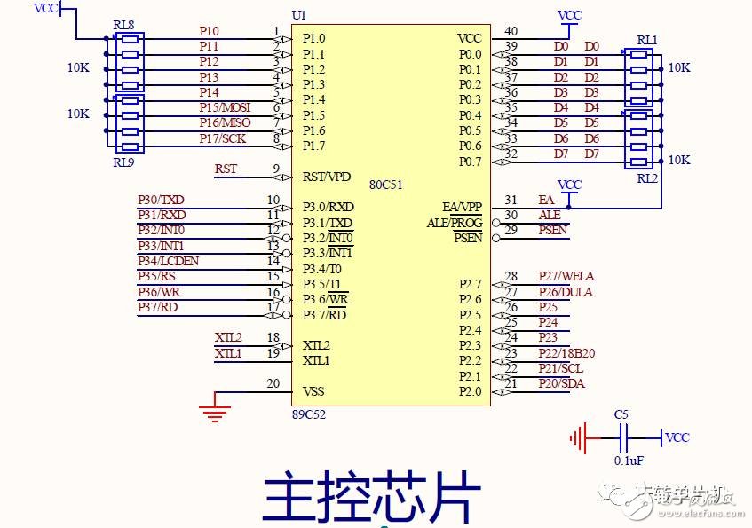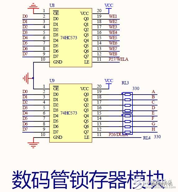 下面三個(gè)圖為開(kāi)發(fā)板的原理圖,此開(kāi)發(fā)板用了兩個(gè)74HC573寄存器,可減少單片機(jī)io口的使用。鎖存器U8用來(lái)控制位選,即控制哪個(gè)數(shù)碼管。U9控制段選,即控制數(shù)碼管顯示什么。數(shù)碼管和鎖存器接在單片機(jī)的P0口。