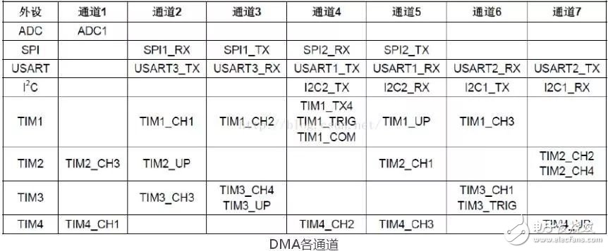 從外設(shè)(TIMx、ADCx、SPIx、I2Cx、和USARTx)產(chǎn)生的DMA請求,通過邏輯或輸入到DMA控制器,這就意味著同時只能有一個請求有效(在同一時間,就只能使用其中的一個,其他通道也類似)。外設(shè)的DMA請求,可以通過設(shè)置相應(yīng)的外設(shè)寄存器中的控制位,被獨立的開啟或關(guān)閉。