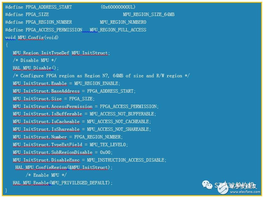 通過(guò)MPU,可以配置不同存儲(chǔ)器空間的訪問(wèn)權(quán)限和Cache策略。HAL庫(kù)里面提供了對(duì)應(yīng)的函數(shù)和例程,參照例程用下面這段代碼就可以解決客戶的問(wèn)題了。數(shù)據(jù)每次都是直接寫到FPGA中,而不是緩存到內(nèi)核的DCACHE中。