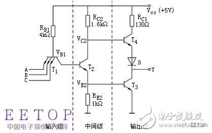 如圖TTL門結(jié)構(gòu),輸出級采用推挽式輸出結(jié)構(gòu),T4為射極跟隨的形式,輸出電阻小,帶負(fù)載能力強(qiáng)。