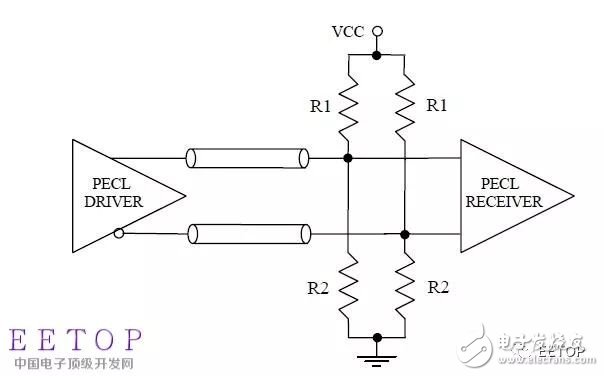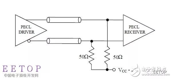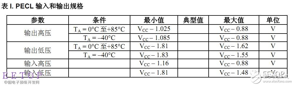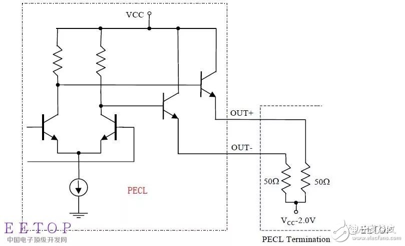 ECL即射極耦合邏輯(Emitter Coupled Logic)采用的是差分結(jié)構(gòu)輸出,并需要負(fù)電源供電。后來發(fā)展處PECL,即正電源射極耦合邏輯?;驹砭褪抢镁w管工作在非飽和區(qū)來減小轉(zhuǎn)換時(shí)間,大大提高轉(zhuǎn)換速度。