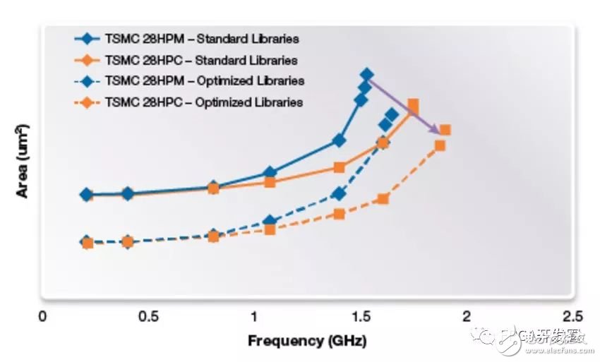 圖9:使用Synopsys邏輯庫將28HPM工藝與28HPC工藝進(jìn)行比較,并添加Synopsys HPC設(shè)計(jì)工具庫,通過時序約束來設(shè)計(jì)32位處理器,直到該庫無法使時序收斂