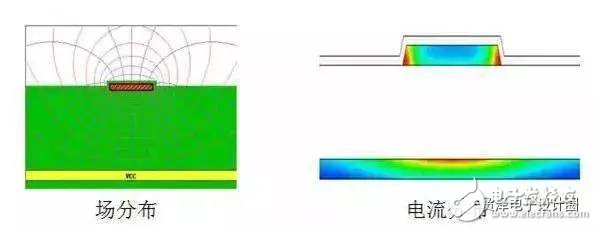 信號路徑是表層走線,所以下面的平面就是參考路徑。對于PCB上這一特殊結(jié)構(gòu),參考路徑是以平面的形式出現(xiàn)的,所以也叫參考平面。從電流回路的角度來說,參考平面承載著信號的返回電流,所以也叫返回平面。下面的圖顯示了表層走線的場分布和電流分布。這里參考平面的作用應(yīng)該很清楚了:作為電磁波傳輸物理環(huán)境的一部分(從電磁波傳輸角度)、作為電流返回路徑(從電流回路角度)。