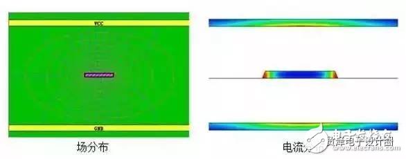 從構(gòu)成電流回路的角度來看,下圖的電流分布圖也很清晰的顯示出返回電流的分布,如果兩個平面和走線之間的間距近似相等,那么兩個平面上的返回電流也近似相等,此時,兩個平面同樣重要。從這個角度也能很好的理解兩個平面都是參考平面。如果還是無法理解為什么兩個平面都是參考平面,不防好好看看下面的這個圖,無論從哪個方面來看,兩個平面是完全對稱的,為什么還糾結(jié)哪個是參考平面,如果一個是,那么另一個為什么不是?