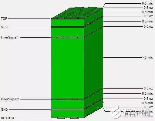 前文指出了如果兩個平面和走線的間距近似相等(這種情況在十幾層的板子上很常見)時,那么兩個平面對于走線的重要性也近似一樣。實際工程中我們還會碰到另一種情況,兩個平面其中之一距離走線很近,另外一個距離走線很遠(yuǎn),比如典型的6層板配置,中間的芯板(Core)厚度通常在1毫米以上。下圖是一個6層板層疊示例,內(nèi)層兩個信號層InnerSignal1和InnerSignal2都屬于這種情況,這時兩個平面對內(nèi)層走線的作用肯定是不同的。這時哪個是參考平面?