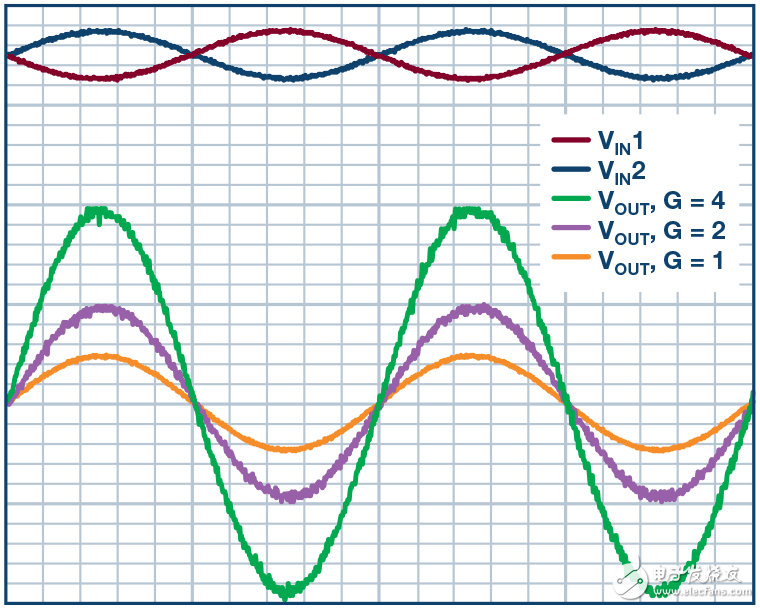 圖2顯示的是施加差分輸入電壓和電路增益變動的情況。RF值可設(shè)置系統(tǒng)增益。可以看到,這張圖顯示的是系統(tǒng)增益1、2 和4,且1 kHz時的差分輸入電壓為1 V p-p。