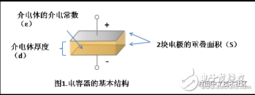 電容器用于儲存電荷,其最基本結(jié)構(gòu)如圖1所示,在2塊電極板中間夾著介電體。