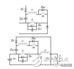 現(xiàn)在諧振技術(shù)還只適合于開(kāi)關(guān)器件較少的變換器,其中ZVS 和ZCS 廣泛應(yīng)用于中功率變換,零轉(zhuǎn)換技術(shù)適宜于大功率(大于100kW) 電能變換/逆變場(chǎng)合。在新型軟開(kāi)關(guān)拓?fù)渲?,文獻(xiàn)[10]提出了一種新穎的ZVZCT PWM變換器,如圖1所示。該軟開(kāi)關(guān)單元包括諧振電容C r1、C r2,諧振電感L r, 輔助開(kāi)關(guān)管Sa 和輔助二極管Ds ,Dsa 和D 1。該電路采用PWM 控制,不僅能實(shí)現(xiàn)主開(kāi)關(guān)管的零電壓和零電流開(kāi)關(guān),并且能實(shí)現(xiàn)輔助開(kāi)關(guān)管的零電流導(dǎo)通和零電壓零電流關(guān)斷,同時(shí)能實(shí)現(xiàn)副邊續(xù)流二極管的零電流零電壓關(guān)斷和零電壓導(dǎo)通。但電路略顯復(fù)雜,且主開(kāi)關(guān)管瞬時(shí)電流峰值較高,二極管D 的開(kāi)通電流有較大幅度振蕩。值得注意的是,軟開(kāi)關(guān)變換器的性能依賴于所用的功率開(kāi)關(guān)器件,如MOSFET 有高的開(kāi)關(guān)速度和較大的寄生電容,容易產(chǎn)生開(kāi)通損耗,因此易采用零電壓開(kāi)通方式;IGBT 由于關(guān)斷時(shí)的電流拖尾會(huì)產(chǎn)生較大的關(guān)斷損耗,易采用零電流關(guān)斷方式。不同器件的動(dòng)態(tài)性能不同,同一個(gè)電路因使用不同的開(kāi)關(guān)器件性能會(huì)有所不同,同一個(gè)器件應(yīng)用于不同的拓?fù)湫阅芤矊⒂泻艽蟛煌?,在選擇軟開(kāi)關(guān)拓?fù)鋾r(shí)要綜合考慮各種因素。另外,任何軟開(kāi)關(guān)技術(shù)都有其不足之處,軟開(kāi)關(guān)技術(shù)控制復(fù)雜,很多時(shí)候并達(dá)不到預(yù)計(jì)的效果,目前還只是集中應(yīng)用在較小功率電源中。