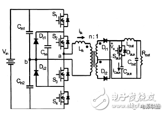 圖4. 移相控制ZVZCS 三電平變換器 Fig 4. The ZVZCS Three-Level converte目前,DC-DC 變換器的多電平技術(shù)仍處于研究階段,由于多電平電路開(kāi)關(guān)管數(shù)目多,工作模態(tài)復(fù)雜,統(tǒng)一建模有一定的困難。如何降低多電平電路的復(fù)雜程度,得到簡(jiǎn)單高效的變換器拓?fù)?,找出有效的多電平技術(shù)建模方法和控制策略是多電平電路用于中低功率變換急需解決的問(wèn)題。6 結(jié)束語(yǔ)半導(dǎo)體器件是電力電子技術(shù)發(fā)展的主要推動(dòng)力,DC-DC 變換器今后的發(fā)展總的方向是高功率密度、高效率、高性能、高可靠性。一般來(lái)說(shuō),(1)在低功率變換器中,采用軟開(kāi)關(guān)技術(shù)減小功率管的應(yīng)力,增加開(kāi)關(guān)頻率,提高轉(zhuǎn)換效率,從而縮小整機(jī)體積,低電壓輸出時(shí)可采用同步整流技術(shù)提高轉(zhuǎn)換效率;(2)在高功率變換器中,盡量簡(jiǎn)化電路拓?fù)?,舍去諸如附加的諧振電路,采用高性能硬開(kāi)關(guān)減少電路的復(fù)雜度從而降 低成本。