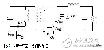 圖2為同步整流正激變換器,Q 2為整流管,Q 3為續(xù)流管。當(dāng)變壓器原邊主開(kāi)關(guān)管Q 1導(dǎo)通時(shí),副邊電流流過(guò)Q 2的體二極管,使V gs3=0,Q 3截止,V gs3=V2,Q 2導(dǎo)通;反之,當(dāng)主開(kāi)關(guān)管Q 1截止時(shí),Q 2截止,Q 3續(xù)流。由于功率MOSFET 的寄生電容與開(kāi)關(guān)電容損耗并存,特別是在高頻時(shí),門極驅(qū)動(dòng)損耗可能較大,現(xiàn)在的同步整流技術(shù)都在努力實(shí)現(xiàn)ZVS 、ZCS 方式