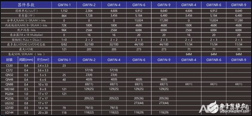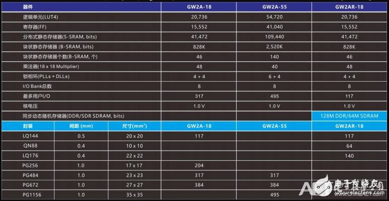 晨熙家族產(chǎn)品作為中密度FPGA典型代表,采用了成熟的55nm SRAM制造工藝,包括GW2A-55、GW2A-18、GW2AR-18三個型號和近十種封裝,擁有不低于競爭對手的片上資源。其中,GW2AR-18中可以提供128M DDR/64M SDRAM同步動態(tài)隨機存儲器,與國外產(chǎn)品實現(xiàn)差異化優(yōu)勢。