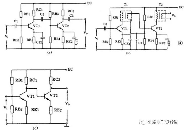 ①RC 耦合(見圖a): 優(yōu)點是簡單、成本低。但性能不是最佳。② 變壓器耦合(見圖b):優(yōu)點是阻抗匹配好、輸出功率和效率高,但變壓器制作比較麻煩。③ 直接耦合(見圖c): 優(yōu)點是頻帶寬,可作直流放大器使用,但前后級工作有牽制,穩(wěn)定性差,設(shè)計制作較麻煩。