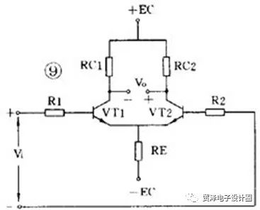 解決零點漂移的辦法是采用差分放大器,下圖是應(yīng)用較廣的射極耦合差分放大器。它使用雙電源,其中 VT1 和 VT2 的特性相同,兩組電阻數(shù)值也相同, R E 有負(fù)反饋作用。實際上這是一個橋形電路,兩個 R C 和兩個管子是四個橋臂,輸出電壓 V 0 從電橋的對角線上取出。沒有輸入信號時,因為 RC1=RC2 和兩管特性相同,所以電橋是平衡的,輸出是零。由于是接成橋形,零點漂移也很小。差分放大器有良好的穩(wěn)定性,因此得到廣泛的應(yīng)用。
